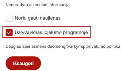 Dalyvavimą internetinės parduotuvės lojalumo programoje galite nutraukti prisijungę prie savo paskyros.